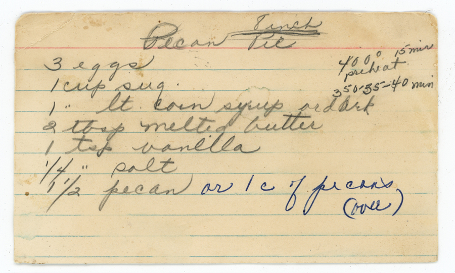« Previous ItemNext Item » Recipe Pecan Pie Description3 eggs1 cup sugar1 cup light corn syrup or dark2 tbsp. melted butter1 tsp vanilla¼ tsp salt1½ pecan or 1 cup of pecans 400° 15 mins pre heat 350°- 35-40 minsMakes an 8-inch pie. Editor's note: Nothing written on the other side of the card.ContributorRose OvianMeal TypeDessertsCuisineAll Recipes Collection Ovian/Megerdichian Citation “Pecan Pie,” Armenians of Whitinsville, accessed April 23, 2026, https://armeniansofwhitinsville.org/items/show/1124. Email Recipe Print Recipe Download Original Comments Your name Website Email (required) Comment Allowed tags: <p>, <a>, <em>, <strong>, <ul>, <ol>, <li> Please verify you're a human
