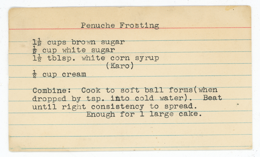 « Previous ItemNext Item » Recipe Penuche Frosting Description1 ½ cups brown sugar ½ cup white sugar 1 ½ tbsp. white corn syrup (Karo) ½ cup cream Combine: Cook to soft ball forms (when dropped by tsp. into cold water). Beat until right consistency to spread. Enough for 1 large cake. ContributorRose OvianMeal TypeDessertsCuisineAll Recipes Collection Ovian/Megerdichian Citation “Penuche Frosting,” Armenians of Whitinsville, accessed April 23, 2026, https://armeniansofwhitinsville.org/items/show/1126. Email Recipe Print Recipe Download Original Comments Your name Website Email (required) Comment Allowed tags: <p>, <a>, <em>, <strong>, <ul>, <ol>, <li> Please verify you're a human