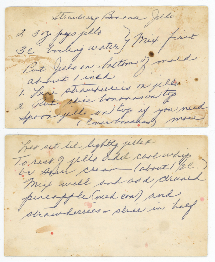 « Previous ItemNext Item » Recipe Strawberry Banana Jello Description2- 3 oz packages of jello3 cups boiling water *Mix these two first* Put Jello in bottom of mold about 1 inch. Line strawberries in Jello. Put sliced banana on top. Spoon jello on top (over banana) if you need more (cover bananas) Let sit until lightly jellied. To rest of Jello, add cool whip or sour cream- about ½ cup. Mix well and add drained pineapple (med can) and strawberries- sliced in half. ContributorRose OvianMeal TypeDessertsCuisineAll Recipes Collection Ovian/Megerdichian Citation “Strawberry Banana Jello,” Armenians of Whitinsville, accessed April 23, 2026, https://armeniansofwhitinsville.org/items/show/1132. Email Recipe Print Recipe Download Original Comments Your name Website Email (required) Comment Allowed tags: <p>, <a>, <em>, <strong>, <ul>, <ol>, <li> Please verify you're a human