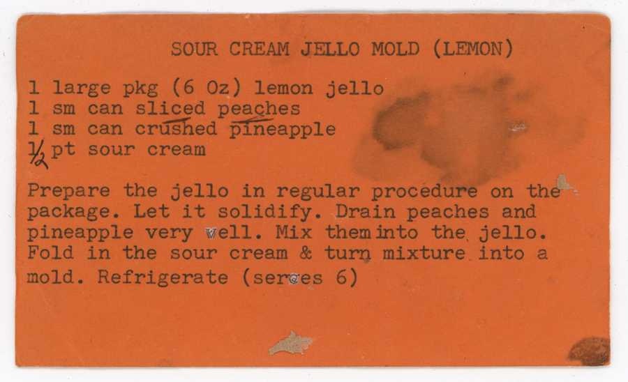 Prepare the Jello in regular procedure on the package. Let it solidify. Drain peaches and pineapple very well. Mix them into the Jello. Fold in the sour cream and turn mixture into a mold. Refrigerate. Serves 6.
