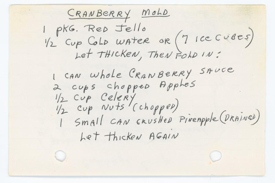 « Previous ItemNext Item » Recipe Cranberry mold DescriptionRecipe for cranberry jello mold.ContributorLucy KheboianDateundatedSubjectCooking, American Cooking (Apples) Cooking (Cranberries) Cooking (Gelatin)Formatrecipe cardsPublisherArmenians of WhitinsvilleRightsAll materials are under copyright by Armenians of Whitinsville.TypetextIdentifieraw01_40Meal TypeDessertsCuisineAll RecipesTextCRANBERRY MOLD 1 pkg. red Jello 1/2 cup cold water or (7 ice cubes) Let thicken then fold in: 1 can whole cranberry sauce 2 cups chopped apples 1/2 cup celery 1/2 cup nuts (chopped) 1 small can crushed pineapple (drained) Let thicken again Collection Kheboian/Mooradian Citation “Cranberry mold,” Armenians of Whitinsville, accessed April 23, 2026, https://armeniansofwhitinsville.org/items/show/149. Email Recipe Print Recipe Download Original Comments Your name Website Email (required) Comment Allowed tags: <p>, <a>, <em>, <strong>, <ul>, <ol>, <li> Please verify you're a human