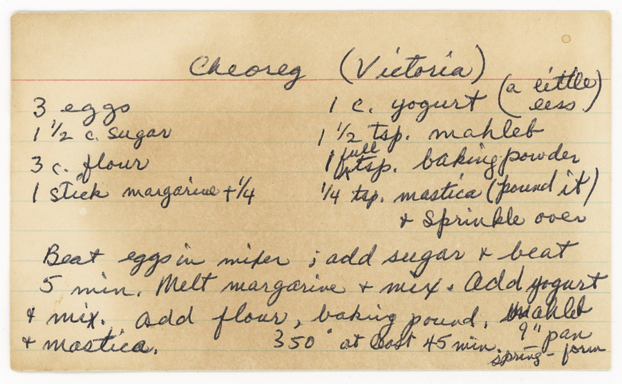 Beat eggs in mixer; add sugar and beat 5 min. Melt margarine and mix. Add yogurt and mix. Add flower, bkg. Powder, Mahleb, and Mastica. Bake at 350 degrees, for 45 min., in a 9” spring form pan.