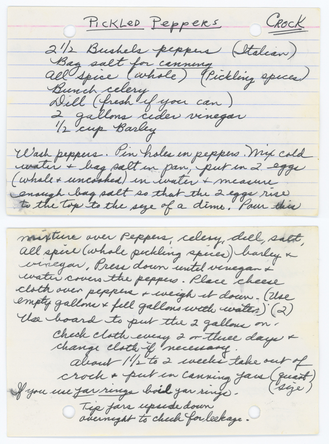 Recipe for pickled peppers made in a crock.Contributor