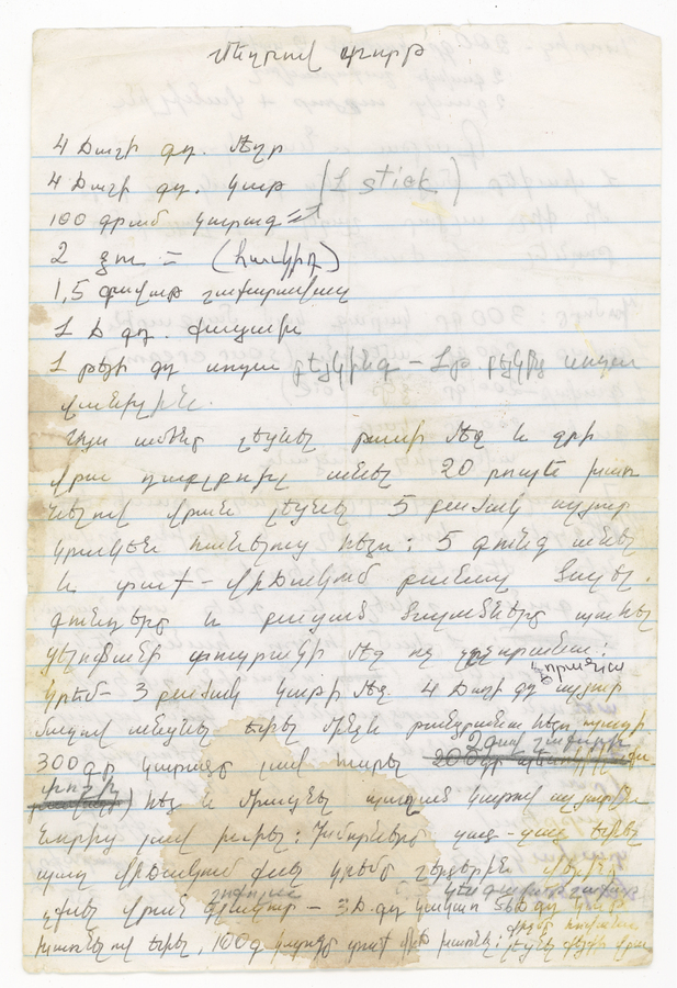« Previous ItemNext Item » Recipe Port with Honey Description4 tb sp honey 4 tb sp milk 100 gm butter (1 stick) 2 eggs 1-1/2 cups sugar 1 tb sp vinegar 1 tsp baking soda 1 tsp vanilla (Can’t translate the rest of recipe, copy is too vague)CreatorManoushag GarabedianContributorManoushag GarabedianMeal TypeDessertsCuisineArmenianName IndexGarabedian, Manoushag Collection Garabedian/Pultoian Citation Manoushag Garabedian, “Port with Honey,” Armenians of Whitinsville, accessed April 23, 2026, https://armeniansofwhitinsville.org/items/show/1708. Email Recipe Print Recipe Download Original Comments Your name Website Email (required) Comment Allowed tags: <p>, <a>, <em>, <strong>, <ul>, <ol>, <li> Please verify you're a human