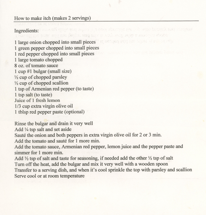 Rinse the bulgar and drain it very well Add ¼ tsp salt and set aside Sauté the onion and both peppers in extra virgin olive oil for 2 or 3 min. Add the tomato and sauté for 1 more min. Add the tomato sauce, Armenian red pepper, lemon juice and the pepper paste and simmer for 1 more min. Add ½ tsp of salt and taste for seasoning, if needed add the other ½ tsp of salt Turn off the heat, add the bulgar and mix it very well with a wooden spoon Transfer to a serving dish, and when it's cool sprinkle the top with parsley and scallion Serve cool or at room temperature