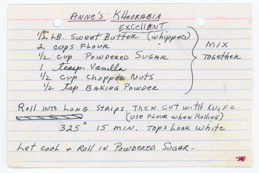 Roll into long strips, then cut with knife (use flour when rolling). 325° 15 min. Tops look white. Let cool & roll in powdered sugar.