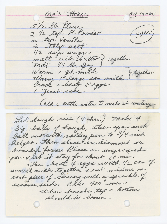 Then beat 4 eggs with 1/2 can of small milk together & rub mixture on each piece of chorag with a sprinkle of sesame seeds. Bake 400° oven. When it cooks top & bottom should be brown.
