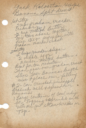 1st step 2 cups graham cracker crumbs ½ cup melted butter Mix two above together. Line 13x9 inches pyrex pan with graham cracker crust 2nd step 2 cups powder sugar 2 whole eggs 2 cubes melted butter Beat for ten minutes. Then pour over graham crust. Slice four bananas lengthwise and place over filling. #2 can crushed pineapple drained well and spread over bananas. 1 large container of cool whip for topping and sprinkle with nuts and put strawberries on top