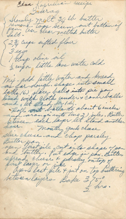 Mix – add little water and knead as far as dough shape into small balls (6). Place balls into pie pan lined with cloth under and cover balls and let stand for 1 hr. Roll out balls to about 6 inches and arrange into 2 piles. Butter between each layer let stand another hour.