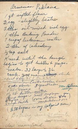 « Previous ItemNext Item » Recipe Armenian Easter Cookie Bread Description5 pds flour3 yeast cakes 1 lb Crisco 1 ½ lb butter melted 1 cup sugar sweet2 cup sugar 6 eggs 2 cups milkMakes about 100 (oven degree 400 gas) (375 degrees in my hot point oven) Baking time 25 minutes Black caraway seedCreatorMrs. BolianContributorJudy GregersonMeal TypeDessertsCuisineArmenianName IndexMrs. Bolian Collection Jundanian/Aghajanian Citation Mrs. Bolian, “Armenian Easter Cookie Bread,” Armenians of Whitinsville, accessed April 23, 2026, https://armeniansofwhitinsville.org/items/show/1845. Email Recipe Print Recipe Download Original Comments Your name Website Email (required) Comment Allowed tags: <p>, <a>, <em>, <strong>, <ul>, <ol>, <li> Please verify you're a human
