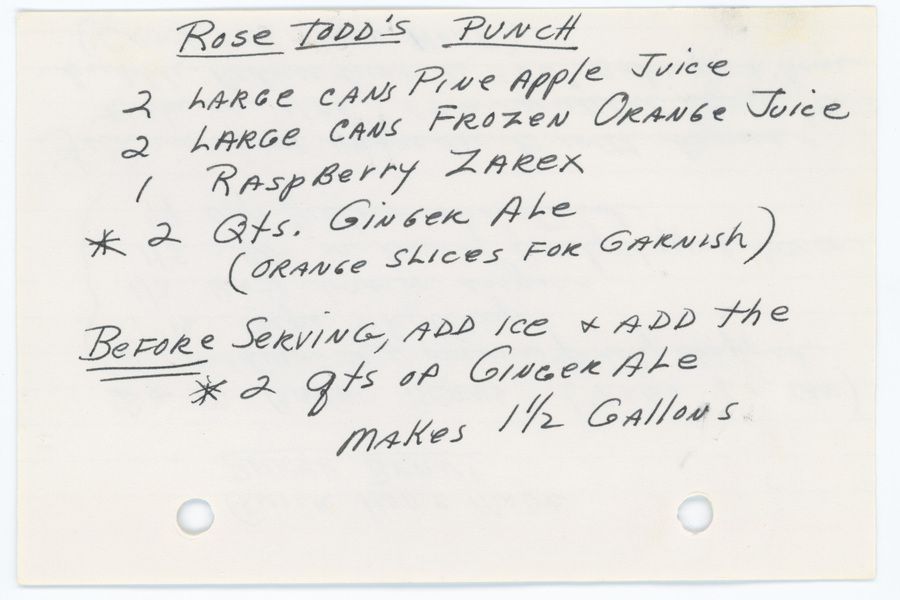 « Previous ItemNext Item » Recipe Rose Todd's punch DescriptionA recipe for punch.ContributorRose ToddDateundatedSubjectOrange juice Pineapple juice Punches (Beverages) Soft drinksFormatrecipe cardsPublisherArmenians of WhitinsvilleRightsAll materials are under copyright by Armenians of Whitinsville.TypetextIdentifieraw01_74Meal TypeBeveragesCuisineAll RecipesTextROSE TODD'S PUNCH Rose Todd's Punch 2 large cans pineapple juice 2 large cans frozen orange juice 1 raspberry Zarex *2 qts. ginger ale (orange slices for garnish) Before serving, add ice & add the *2 qts. of ginger ale Makes 1 1/2 gallons Collection Kheboian/Mooradian Citation “Rose Todd's punch,” Armenians of Whitinsville, accessed April 23, 2026, https://armeniansofwhitinsville.org/items/show/185. Email Recipe Print Recipe Download Original Comments Your name Website Email (required) Comment Allowed tags: <p>, <a>, <em>, <strong>, <ul>, <ol>, <li> Please verify you're a human