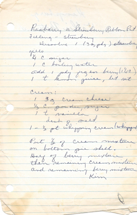 « Previous ItemNext Item » Recipe Raspberry or Strawberry Ribbon Pit DescriptionFilling - strawberryDissolve 1 (3 oz pkg) strawberry jello ¼ c sugar 1 c boiling water Add 1 pkg frozen berry (?)1 t lemon juice, let set Cream:1 3 oz cream cheese 1/3 c. powder sugar 1 t vanillaDash g salt 1 - ½ pt whipping cream (whipped) Put ½ oz cream mixture on bottom pie shell. Half of berry mixture then remaining cream mixture and remaining berry mixture.CreatorMary SimonianContributorJudy GregersonMeal TypeDessertsCuisineAll RecipesName IndexSimonian, Mary Collection Jundanian/Aghajanian Citation Mary Simonian, “Raspberry or Strawberry Ribbon Pit,” Armenians of Whitinsville, accessed April 23, 2026, https://armeniansofwhitinsville.org/items/show/1873. Email Recipe Print Recipe Download Original Comments Your name Website Email (required) Comment Allowed tags: <p>, <a>, <em>, <strong>, <ul>, <ol>, <li> Please verify you're a human