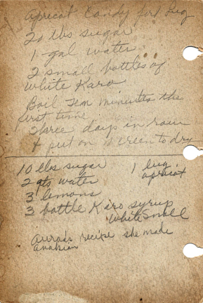 « Previous ItemNext Item » Recipe Apricot Candy Description20 lbs sugar 1 gal water 2 small bottles of white Boil ten minutes the first time. Share? Days in room and put on screen to dry 10 lbs sugar 2 qts water 3 lemons 3 bottle Karo syrup white small 1 kg apricot Aura’s recipe she made Anakian?CreatorMary SimonianContributorJudy GregersonMeal TypeDessertsCuisineAll RecipesName IndexSimonian, Mary Collection Jundanian/Aghajanian Citation Mary Simonian, “Apricot Candy,” Armenians of Whitinsville, accessed April 23, 2026, https://armeniansofwhitinsville.org/items/show/1900. Email Recipe Print Recipe Download Original Comments Your name Website Email (required) Comment Allowed tags: <p>, <a>, <em>, <strong>, <ul>, <ol>, <li> Please verify you're a human