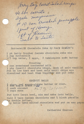 « Previous ItemNext Item » Recipe Perry Boy’s Carrot Salad Recipe Description40 lbs carrots 2 gals mayonnaise # 10 can crushed pineapple 1 pint of honey 1 qt of raisins Salt to tasteCreatorPerry BoyContributorJudy GregersonMeal TypeSaladsCuisineAll RecipesName IndexBoy, Perry Collection Jundanian/Aghajanian Citation Perry Boy, “Perry Boy’s Carrot Salad Recipe,” Armenians of Whitinsville, accessed April 23, 2026, https://armeniansofwhitinsville.org/items/show/1908. Email Recipe Print Recipe Download Original Comments Your name Website Email (required) Comment Allowed tags: <p>, <a>, <em>, <strong>, <ul>, <ol>, <li> Please verify you're a human