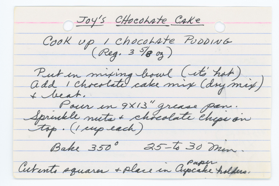 Pour in 9 x 13" grease pan. Sprinkle nuts + chocolate chips on top. (1 cup each)
