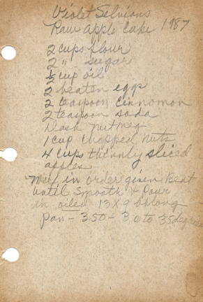 « Previous ItemNext Item » Recipe Violet Selnian’s Raw Apple Cake Description2 cups flour 2 cups sugar ½ cup oil 2 beaten eggs 2 teaspoon cinnamon 2 teaspoon soda Dash nutmeg 1 cup chopped nuts 4 cups thinly sliced applesMix in order given. Beat until smooth and pour in oiled 13x9 oblong pan - 350- 30 to 35 degreesCreatorViolet SelnianContributorJudy GregersonDate1987Meal TypeDessertsCuisineAll RecipesName IndexSelnian, Violet Collection Jundanian/Aghajanian Citation Violet Selnian, “Violet Selnian’s Raw Apple Cake,” Armenians of Whitinsville, accessed April 23, 2026, https://armeniansofwhitinsville.org/items/show/1922. Email Recipe Print Recipe Download Original Comments Your name Website Email (required) Comment Allowed tags: <p>, <a>, <em>, <strong>, <ul>, <ol>, <li> Please verify you're a human
