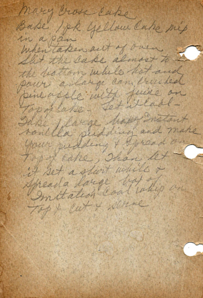 Bake 1 pk yellow cake mix in a pan. When taken out of oven slit the cake almost to the bottom while hot and pour a large can crushed pineapple with juice on top of cake. Let it cool. Take 1 large bag of instant vanilla pudding and make your pudding and spread over top of cake. Then let it set a short while and spread a large bag of imitation cool whip on top and cut and serve.