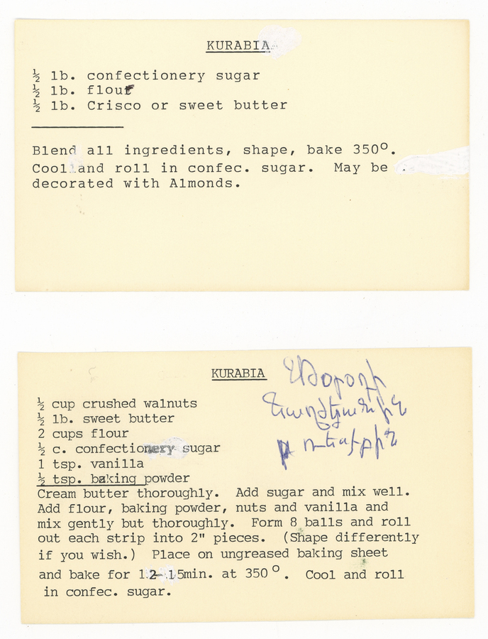 Manoushag Garabedian, “Kurabia (Two Ways),” Armenians of Whitinsville, accessed April 23, 2026, https://armeniansofwhitinsville.org/items/show/2043.