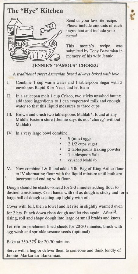 Jennie Markarian Barsamian, “Jennie's Famous Choreg,” Armenians of Whitinsville, accessed April 23, 2026, https://armeniansofwhitinsville.org/items/show/2045.