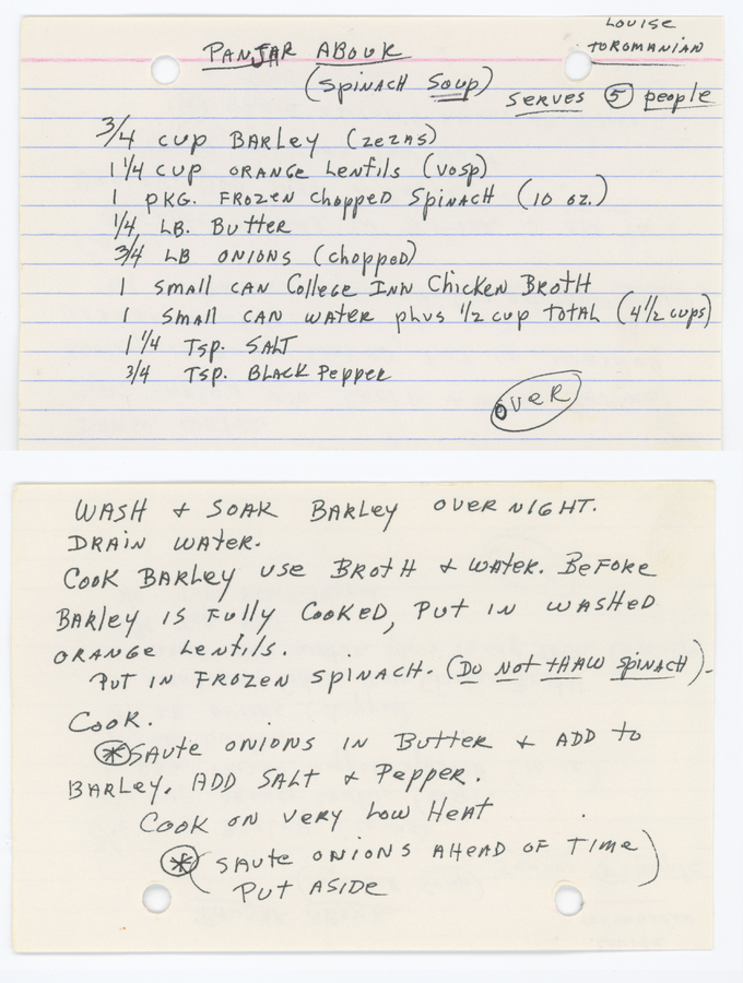 “Panjar abour (spinach soup),” Armenians of Whitinsville, accessed April 23, 2026, https://armeniansofwhitinsville.org/items/show/209.