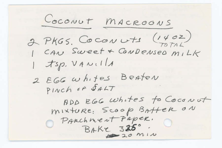 « Previous ItemNext Item » Recipe Coconut macroons (3) DescriptionA recipe for coconut macaroons.ContributorLucy KheboianDateundatedSubjectCookies Cooking (Coconut) DessertsFormatrecipe cardsPublisherArmenians of WhitinsvilleRightsAll materials are under copyright by Armenians of Whitinsville.TypetextIdentifieraw01_98Meal TypeDessertsCuisineAll RecipesTextCoconut Macroons 2 pkgs. coconuts (14 oz total) 1 can sweet & condensed milk 1 tsp. vanilla 2 egg whites beaten pinch of salt Add egg whites to coconut mixture: scoop batter on parchment paper. Bake 325° for 20 min Collection Kheboian/Mooradian Citation “Coconut macroons (3),” Armenians of Whitinsville, accessed April 23, 2026, https://armeniansofwhitinsville.org/items/show/210. Email Recipe Print Recipe Download Original Comments Your name Website Email (required) Comment Allowed tags: <p>, <a>, <em>, <strong>, <ul>, <ol>, <li> Please verify you're a human