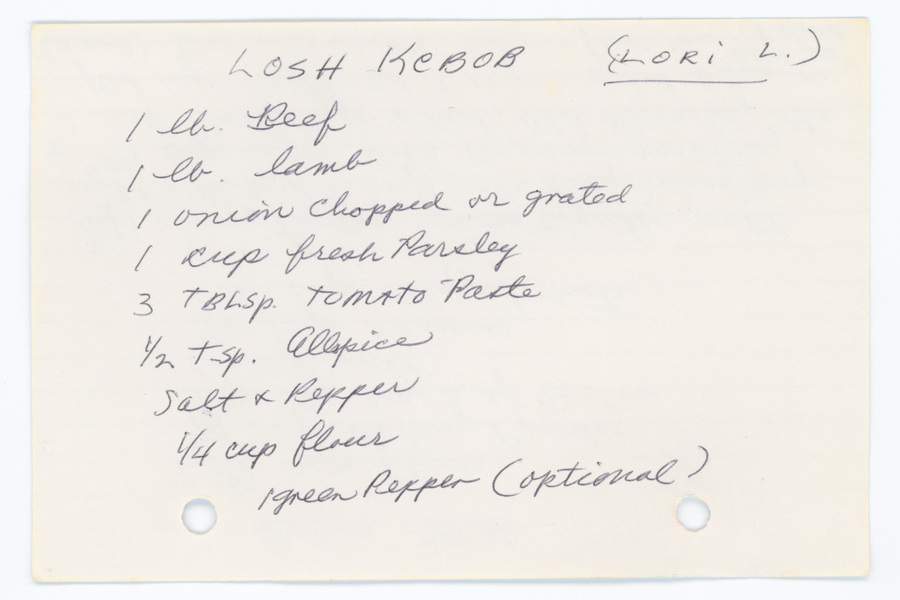 « Previous ItemNext Item » Recipe Losh kebob (Lori L.) DescriptionA recipe for losh kebob.ContributorLucy KheboianDateundatedSubjectCooking, Armenian Cooking (Beef) Cooking (Lamb and Mutton) HamburgersFormatrecipe cardsPublisherArmenians of WhitinsvilleRightsAll materials are under copyright by Armenians of Whitinsville.TypetextIdentifieraw01_104Meal TypeMeat and PoultryCuisineArmenianTextLOSH KEBOB (Lori L.) 1 lb. beef 1 lb. lamb 1 onion chopped or grated 1 cup fresh parsley 3 tbsp tomato paste 1/2 tsp allspice Salt + Pepper 1/4 cup flour 1 green pepper (optional) Collection Kheboian/Mooradian Citation “Losh kebob (Lori L.),” Armenians of Whitinsville, accessed April 24, 2026, https://armeniansofwhitinsville.org/items/show/216. Email Recipe Print Recipe Download Original Comments Your name Website Email (required) Comment Allowed tags: <p>, <a>, <em>, <strong>, <ul>, <ol>, <li> Please verify you're a human