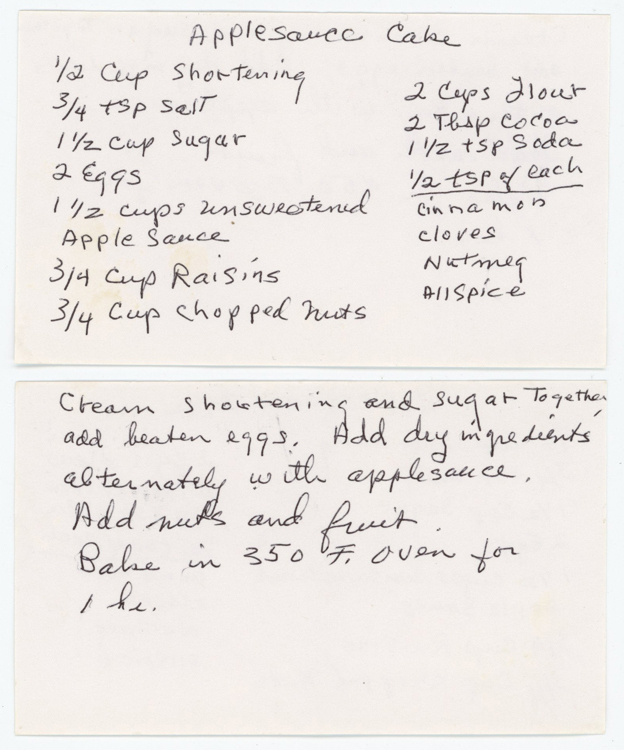 Cream shortening and sugar together. Add beaten eggs. Add dry ingredients alternately with applesauce.