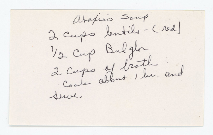 « Previous ItemNext Item » Recipe Araxie's Soup Description2 cups lentils - (red) ½ cup Bulglor 2 cups of broth Cook about 1 hr. and serve.ContributorRose JundanianMeal TypeSoupsCuisineArmenian Collection Jundanian/Aghajanian Citation “Araxie's Soup,” Armenians of Whitinsville, accessed April 23, 2026, https://armeniansofwhitinsville.org/items/show/481. Email Recipe Print Recipe Download Original Comments Your name Website Email (required) Comment Allowed tags: <p>, <a>, <em>, <strong>, <ul>, <ol>, <li> Please verify you're a human