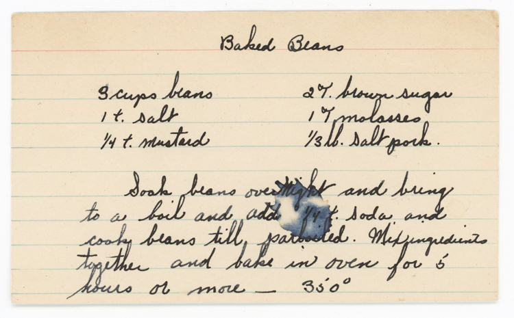 « Previous ItemNext Item » Recipe Baked Beans Description3 cups beans 1 t. salt ¼ t. mustard 2 T. brown sugar 1 T molasses ⅓ lb. salt pork. Soak beans overnight and bring to a boil and add ¼ t. soda and cook beans till parboiled. Mix ingredients together and bake in oven for 5 hours or more – 350°ContributorRose Jundanian Collection Jundanian/Aghajanian Citation “Baked Beans,” Armenians of Whitinsville, accessed April 23, 2026, https://armeniansofwhitinsville.org/items/show/482. Email Recipe Print Recipe Download Original Comments Your name Website Email (required) Comment Allowed tags: <p>, <a>, <em>, <strong>, <ul>, <ol>, <li> Please verify you're a human