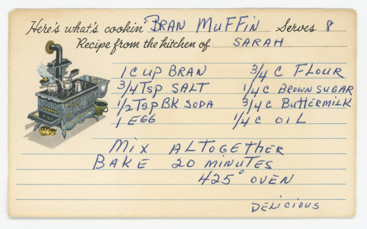 « Previous ItemNext Item » Recipe Bran muffin (Sarah) DescriptionRecipe for bran muffins.ContributorRose JundanianDateundatedSubjectBaking Bran Desserts MuffinsFormatrecipe cardsPublisherArmenians of WhitinsvilleRightsAll materials are under copyright by Armenians of Whitinsville.TypetextIdentifieraw01_110Meal TypeDessertsBreadsCuisineAll RecipesTextHere's what's cookin: Bran Muffin Serves 8 Recipe from the kitchen of Sarah 1 Cup Bran ¾ tsp Salt ½ tsp Bk Soda 1 Egg ¾ C Flour ¼ C Brown Sugar ¾ C Buttermilk ¼ C Oil Mix altogether Bake 20 minutes 425° Oven Delicious Collection Kheboian/Mooradian Citation “Bran muffin (Sarah),” Armenians of Whitinsville, accessed April 23, 2026, https://armeniansofwhitinsville.org/items/show/485. Email Recipe Print Recipe Download Original Comments Your name Website Email (required) Comment Allowed tags: <p>, <a>, <em>, <strong>, <ul>, <ol>, <li> Please verify you're a human