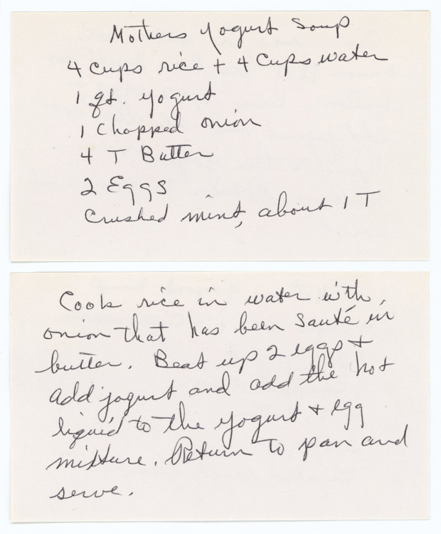 « Previous ItemNext Item » Recipe Mother's Yogurt Soup (Pailoon) Description4 cups rice 4 cups water 1 quart yogurt 1 chopped onion 4 Tbsp. butter 2 eggs crushed mint, about 1 Tbsp. Cook rice in water with onion that has been sautéed in butter. Beat up 2 eggs & add yogurt. Add the hot liquid to the yogurt and egg mixture. Return to pan and serve.Meal TypeSoupsGrainsEggs and DairyCuisineArmenian Collection Jundanian/Aghajanian Citation “Mother's Yogurt Soup (Pailoon),” Armenians of Whitinsville, accessed April 23, 2026, https://armeniansofwhitinsville.org/items/show/541. Email Recipe Print Recipe Download Original Comments Your name Website Email (required) Comment Allowed tags: <p>, <a>, <em>, <strong>, <ul>, <ol>, <li> Please verify you're a human