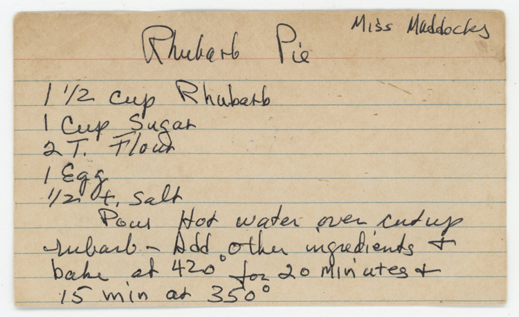 « Previous ItemNext Item » Recipe Rhubarb Pie (Miss Maddocks) Description1-1/2 cups rhubarb 1 cup sugar 2 Tbsp. flour 1 egg 1/2 tsp. salt Pour hot water over cut up rhubarb. Add other ingredients & bake at 420° for 20 minutes & 15 min at 350°. ContributorRose JundanianMeal TypeDessertsCuisineAll Recipes Collection Jundanian/Aghajanian Citation “Rhubarb Pie (Miss Maddocks),” Armenians of Whitinsville, accessed April 23, 2026, https://armeniansofwhitinsville.org/items/show/557. Email Recipe Print Recipe Download Original Comments Your name Website Email (required) Comment Allowed tags: <p>, <a>, <em>, <strong>, <ul>, <ol>, <li> Please verify you're a human