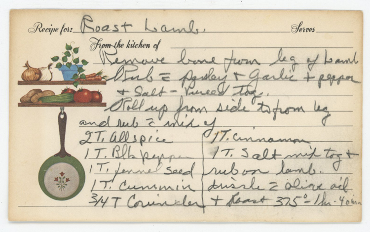 « Previous ItemNext Item » Recipe Roast Lamb DescriptionRemove bone from leg of lamb. Rub with parsley & garlic & pepper & salt pureed together. Roll up from side to form leg and rub with mix of 2 Tbsp. allspice 1 Tbsp. black pepper 1 Tbsp. fennel seed 1 Tbsp. cumin 3/4 Tbsp. coriander 1 Tbsp. cinnamon 1 Tbsp. salt Mix together & rub on lamb. Drizzle with olive oil & roast 375° - 1 hr 40 min. ContributorRose JundanianMeal TypeMeat and PoultryCuisineAll Recipes Collection Jundanian/Aghajanian Citation “Roast Lamb,” Armenians of Whitinsville, accessed April 23, 2026, https://armeniansofwhitinsville.org/items/show/558. Email Recipe Print Recipe Download Original Comments Your name Website Email (required) Comment Allowed tags: <p>, <a>, <em>, <strong>, <ul>, <ol>, <li> Please verify you're a human
