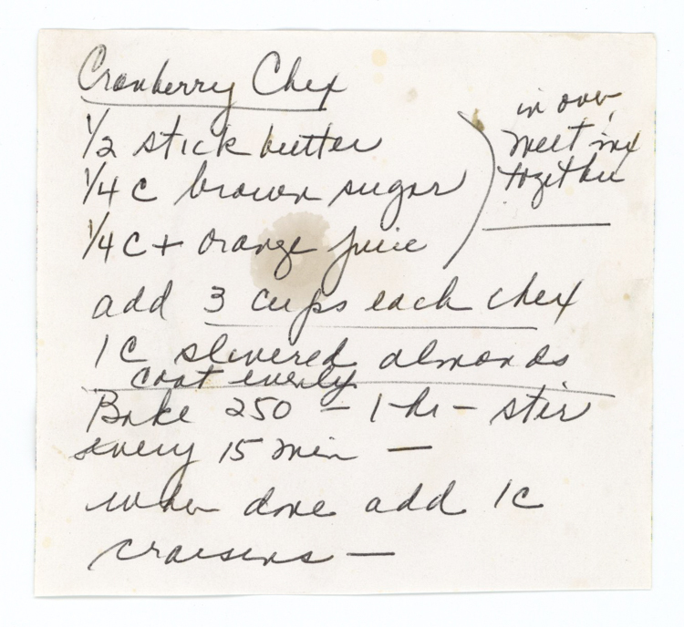 « Previous ItemNext Item » Recipe Cranberry Chex DescriptionIn oven, melt + mix together: 1/2 stick butter 1/4 cup brown sugar 1/4 cup orange juice Add 3 cups each Chex and 1 cup slivered almonds. Coat evenly. Bake 250° 1 hour, stir every 15 min. When done add 1 cup Craisins.ContributorClaire MalkasianMeal TypeMiscellaneousCuisineAll Recipes Collection Malkasian/Tashjian Citation “Cranberry Chex,” Armenians of Whitinsville, accessed April 23, 2026, https://armeniansofwhitinsville.org/items/show/610. Email Recipe Print Recipe Download Original Comments Your name Website Email (required) Comment Allowed tags: <p>, <a>, <em>, <strong>, <ul>, <ol>, <li> Please verify you're a human