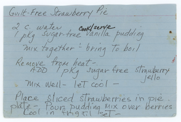« Previous ItemNext Item » Recipe Guilt Free Strawberry Pie Description2 cups water 1 pkg sugar-free vanilla pudding Mix together + bring to a boil. Remove from heat. Add 1 pkg sugar-free strawberry Jello. Mix well, let cool. Place sliced strawberries in pie plate. Pour pudding mix over berries. Cool in fridge until set.ContributorClaire MalkasianMeal TypeDessertsCuisineAll Recipes Collection Malkasian/Tashjian Citation “Guilt Free Strawberry Pie,” Armenians of Whitinsville, accessed April 23, 2026, https://armeniansofwhitinsville.org/items/show/617. Email Recipe Print Recipe Download Original Comments Your name Website Email (required) Comment Allowed tags: <p>, <a>, <em>, <strong>, <ul>, <ol>, <li> Please verify you're a human