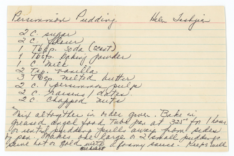 « Previous ItemNext Item » Recipe Persimmon Pudding (Helen Tashjian) Description2 cups sugar 2 cups flour 1 Tbsp. baking soda (scant) 1 Tbsp. baking powder 1 cup milk 2 tsp. vanilla 3 Tbsp. melted butter 2 cups persimmon pulp 2 cups raisins / dates 2 cups chopped nuts Mix altogether in order given. Bake in greased angel food tube pan at 325° for 1 hour or until pudding pulls away from sides of pan. Makes one large or 2 small puddings. Serve hot or cold with a foamy sauce. Keeps well.ContributorClaire TashjianMeal TypeDessertsCuisineAll Recipes Collection Malkasian/Tashjian Citation “Persimmon Pudding (Helen Tashjian),” Armenians of Whitinsville, accessed April 23, 2026, https://armeniansofwhitinsville.org/items/show/646. Email Recipe Print Recipe Download Original Comments Your name Website Email (required) Comment Allowed tags: <p>, <a>, <em>, <strong>, <ul>, <ol>, <li> Please verify you're a human
