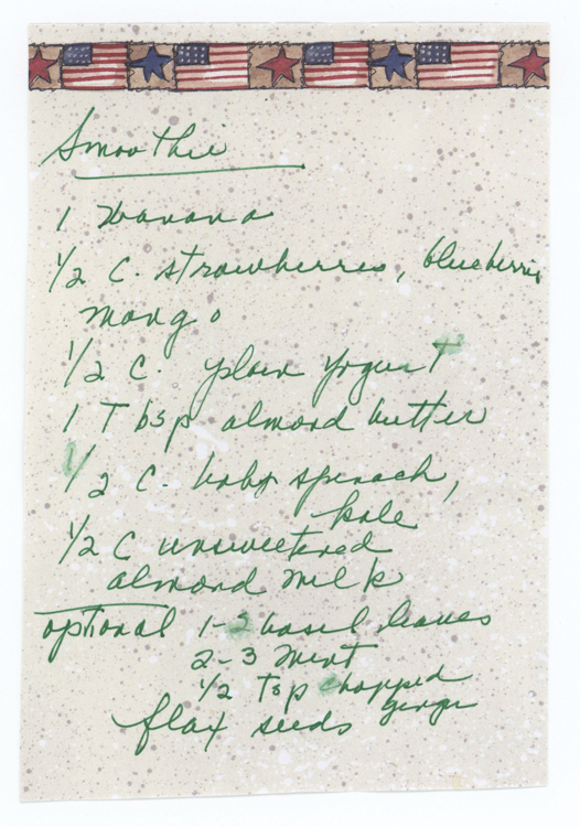 « Previous ItemNext Item » Recipe Smoothie Description1 banana 1/2 cup strawberries 1/2 cup blueberries 1/2 cup mango 1/2 cup plain yogurt 1 Tbsp. almond butter 1/2 cup baby spinach 1/2 cup kale 1/2 cup unsweetened almond milk Optional: 1-2 basil leaves 2-3 mint leaves 1/2 tsp. chopped ginger flax seedsContributorClaire MalkasianMeal TypeBeveragesCuisineAll Recipes Collection Malkasian/Tashjian Citation “Smoothie,” Armenians of Whitinsville, accessed April 23, 2026, https://armeniansofwhitinsville.org/items/show/660. Email Recipe Print Recipe Download Original Comments Your name Website Email (required) Comment Allowed tags: <p>, <a>, <em>, <strong>, <ul>, <ol>, <li> Please verify you're a human