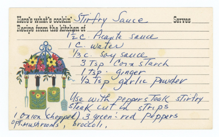 « Previous ItemNext Item » Recipe Stir Fry Sauce Description1-1/2 cups Picante sauce 1 cup water 1/3 cup soy sauce 3 tsp. cornstarch 1 tsp. ginger 1/2 tsp. garlic powder Use with pepper steak. Stir fry: Steak cut in strips 1 onion (chopped) 3 green + red peppers optional: mushrooms, broccoli.ContributorClaire MalkasianMeal TypeMiscellaneousCuisineAll Recipes Collection Malkasian/Tashjian Citation “Stir Fry Sauce,” Armenians of Whitinsville, accessed April 23, 2026, https://armeniansofwhitinsville.org/items/show/664. Email Recipe Print Recipe Download Original Comments Your name Website Email (required) Comment Allowed tags: <p>, <a>, <em>, <strong>, <ul>, <ol>, <li> Please verify you're a human