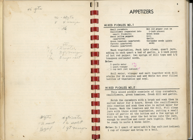 Wash vegetables. Pack into clean, quart jars, adding to each quart a bud of garlic, a 1-inch piece of hot red pepper, two sprigs of dill tops and ½ teaspoon coriander seeds.