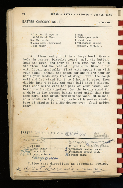 Follow instructions as preceding recipe *do not decrease sugar* 400° oven. Sift flour and put it in a large bowl. Make a hole in center. Dissolve yeast, melt the butter, beat the eggs, and pour all this into the hole in the flour. Add the rest of ingredients. Blend flour with liquid gradually, first with spoon then with your hands. Knead the dough for about ½ hour or until your hands stay free of dough. Cover the dough well and let stand for 4 to 5 hours to rise. Then divide into 4 balls. Cut each ball into 3 slices, roll each slice with the palm of your hands, and braid the 3 rolls together. Let the braids stand for a while on the greased baking sheet until they rise some more. Then brush them with egg yoke. Put blanched almonds on top, or sprinkle with sesame seeds.